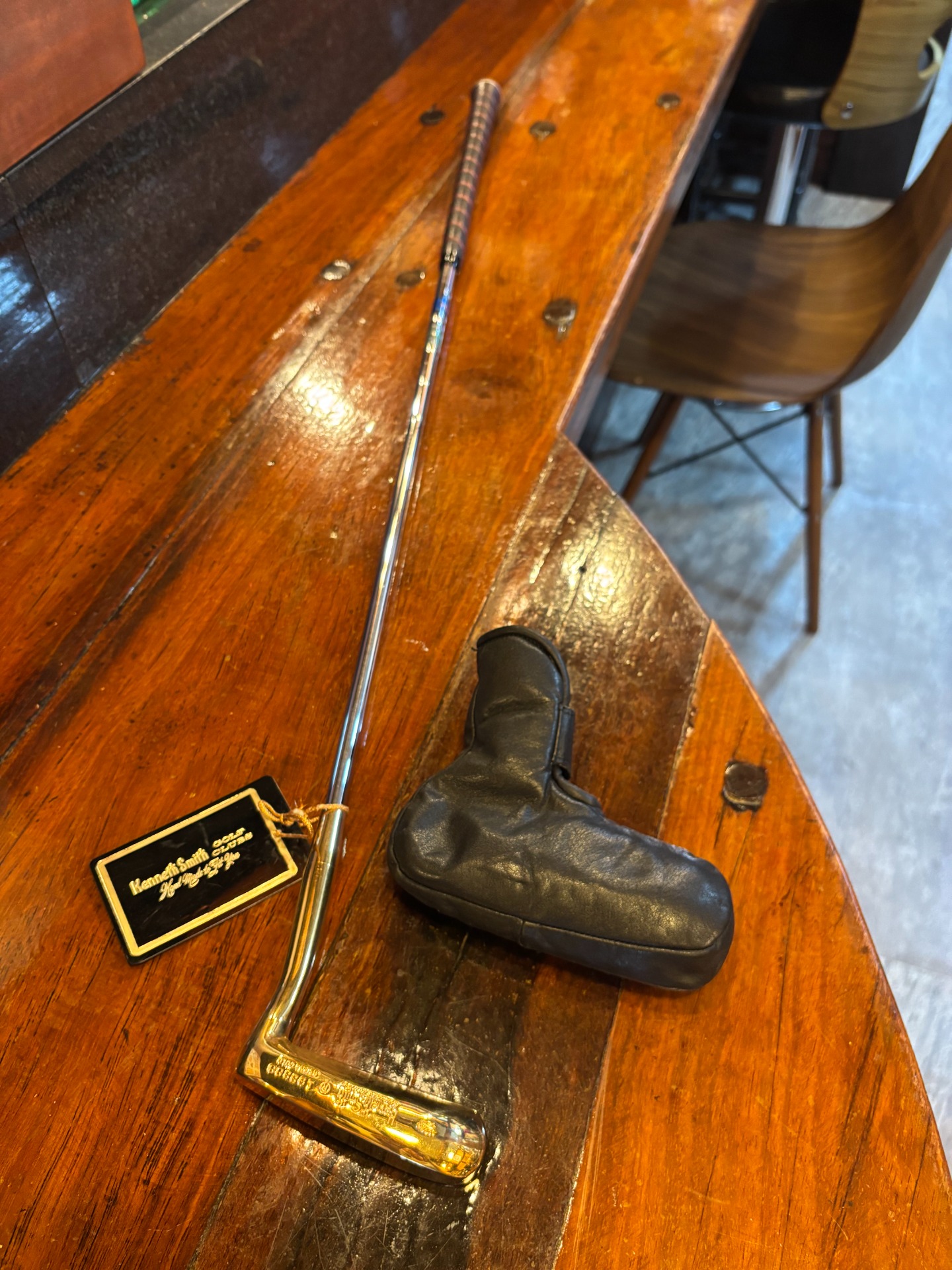 「ゴルフ界のロールスロイス」と称されるケネス・スミスは、顧客一人ひとりのためにクラブを完全オーダーメイドすることで知られていました。このパターもその哲学に則って作られており、下げ札にはブランドの誇りである**「Hand Made to Fit You(あなたに合わせて手作り)」の文字が輝いています。ケネス・スミスというブランドの希少性、完全オーダーメイドという特別感、そして豪華な金メッキ仕上げという要素が組み合わさることで、ゴルフ愛好家のコレクターズアイテムにふさわしい逸品。未使用に近い状態でオリジナルの下げ札が付。